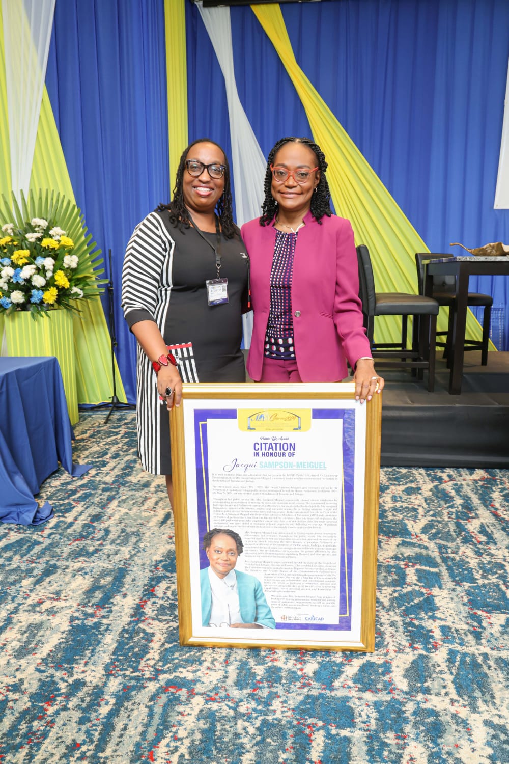 Mrs. Sampson Meiguel was recognised as “a visionary leader who has revolutionized Parliament in the Republic of Trinidad and Tobago” who gave “yeoman’s service to the Trinidad and Tobago public service” in her capacity as Clerk of the House, having since moved on to be sworn in as the Ombudsman of Trinidad and Tobago.